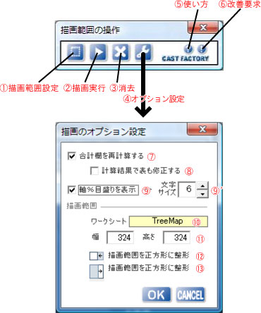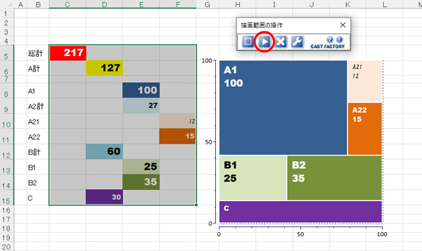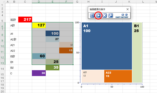 | A描画実行 | 選択した表を用いて、描画範囲にツリーマップを作図します。 |