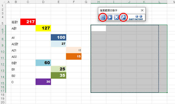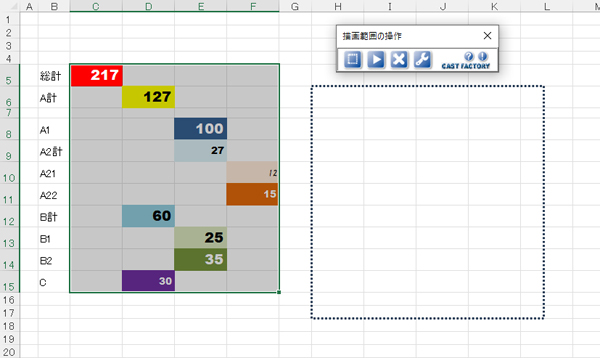 セルの範囲を選択して、コンソールの左端の「描画範囲設定」ボタンをクリックします。描画範囲が、点線で囲まれて表示されます。