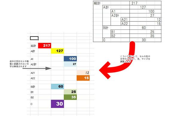 項目名は、数値表の範囲の外側の該当する行であれば、どこの列にあってもかまいません。左にたどって最初の有効なセルの内容が項目名として採用されます。