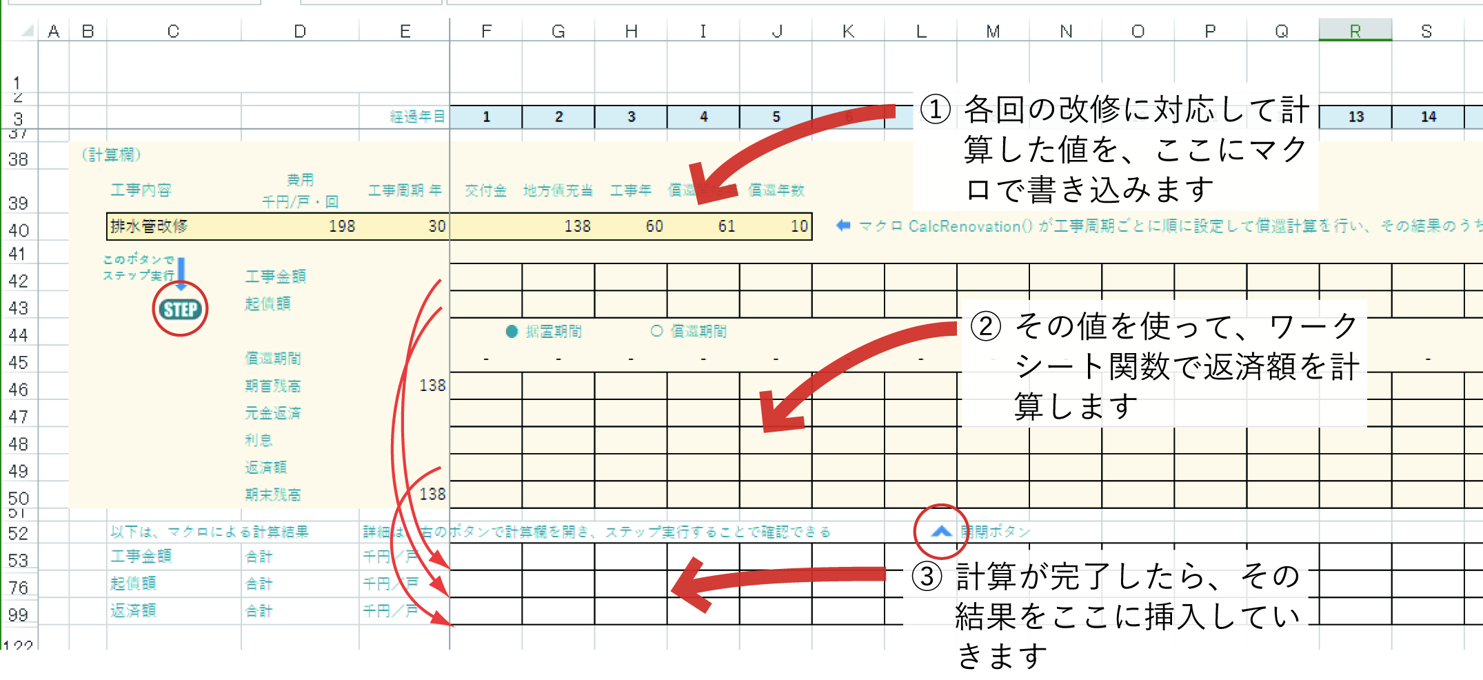 該当工事の一回ごとに、(計算欄)として準備した中の40行に、その回の工事年次から計算した償還開始年と償還年数をマクロで記入し、それにもとづいてワークシート関数で「工事金額」「起債額」「期首残高」「元金返済」「利息」、それをあわせた「返済額」と「期末残高」を計算します。その結果を、最下部に用意した3行にそれぞれ挿入して、各年の経費を計算する、というのが大まかなスキームです。