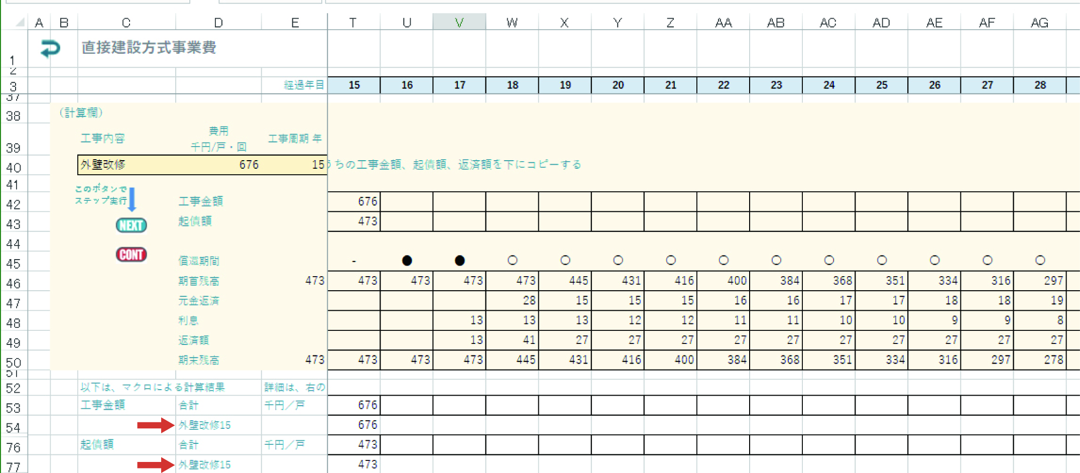 開閉ボタンをクリックすると、(計算欄)が見えるようにしてあります。その中の STEP ボタンをクリックすると、外壁改修の一回目の結果が(計算欄)の中に表示されます。外壁改修を15年周期としていると、一回目は15年目になり、そこで工事が発生し、起債が行われます。それから据置期間は利息のみ支払い、その後元金の返済が行われます。画面は15年目のところにスクロールします。