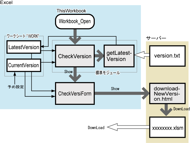 以上の準備をして、次の CheckVersion() を Workbook_Open() から呼ぶことになります。