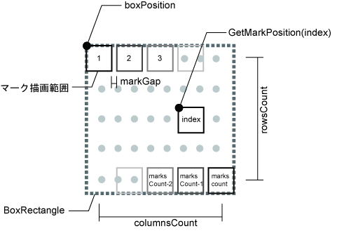 '----- マーク描画エリアの位置と大きさ、描画するマークの行・列数の計算