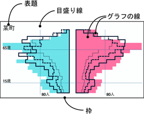 たとえば、「栄町」のグループは「栄町-title」「栄町-Grid」「栄町female」「栄町male」「栄町-frame」で構成されていて、さらに「栄町-Grid」は4つのグループで、「栄町female」と「栄町male」はそれぞれ4個のオブジェクトで構成されているのがわかります。