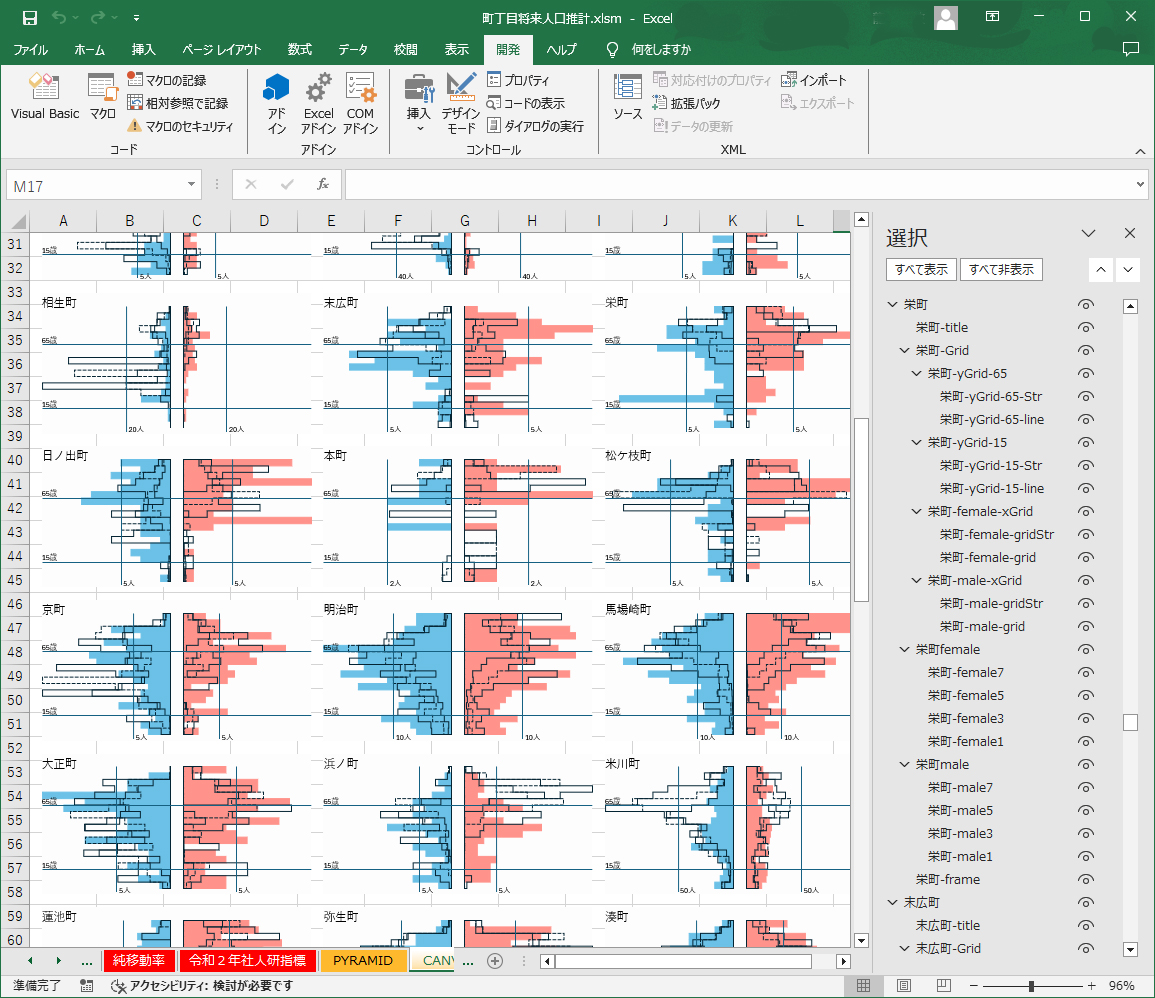 End Function実際に、50個ほどのグラフを逐次左上に作成し、完成したものを所定の位置に再配置して、次のような一覧を作成しました。この内容自体は重要ではないのですが、右に「図形の書式 > オブジェクトの選択と表示」でオブジェクトの構成を表示したものを掲げておきました。