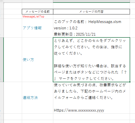 ここでは、Help という名称のワークシートを用意して、こんな感じの一覧表を作成しました。表の始まりがわかるように、表の左上のセルの直上のセルに MessageListTop という名前をつけてあります。左上のセルに直接名前をつけると、挿入削除などの操作を行うたびに混乱してしまいます。