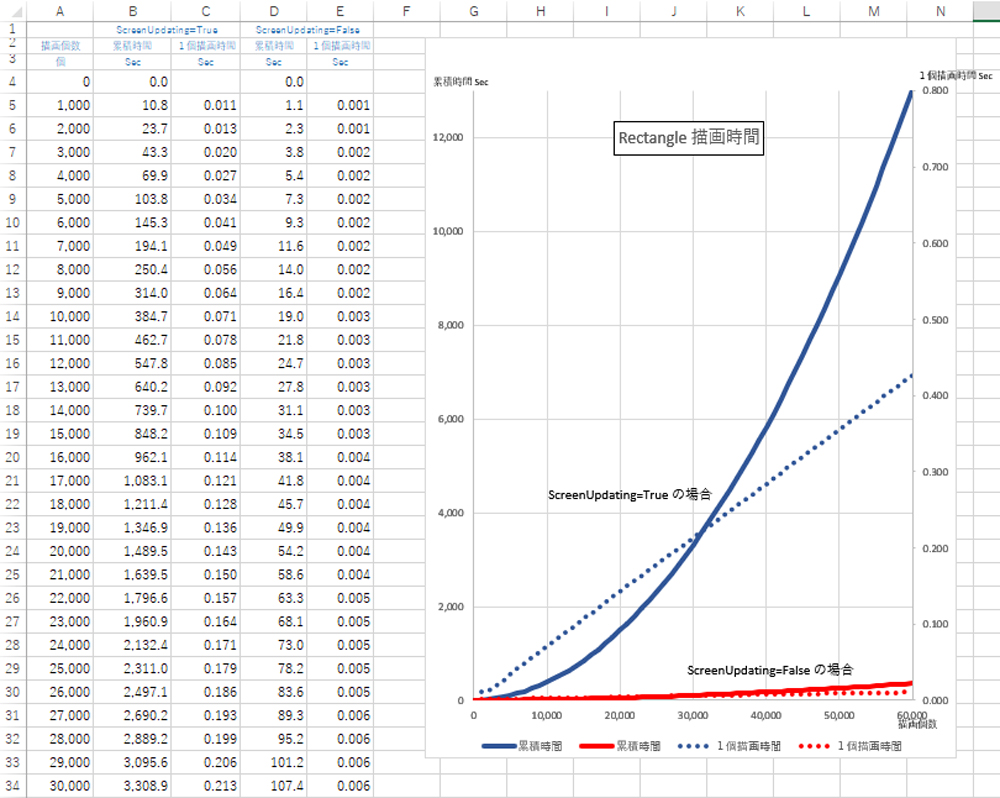 | 描画個数 | ScreenUpdating=True | ScreenUpdating=False | ||